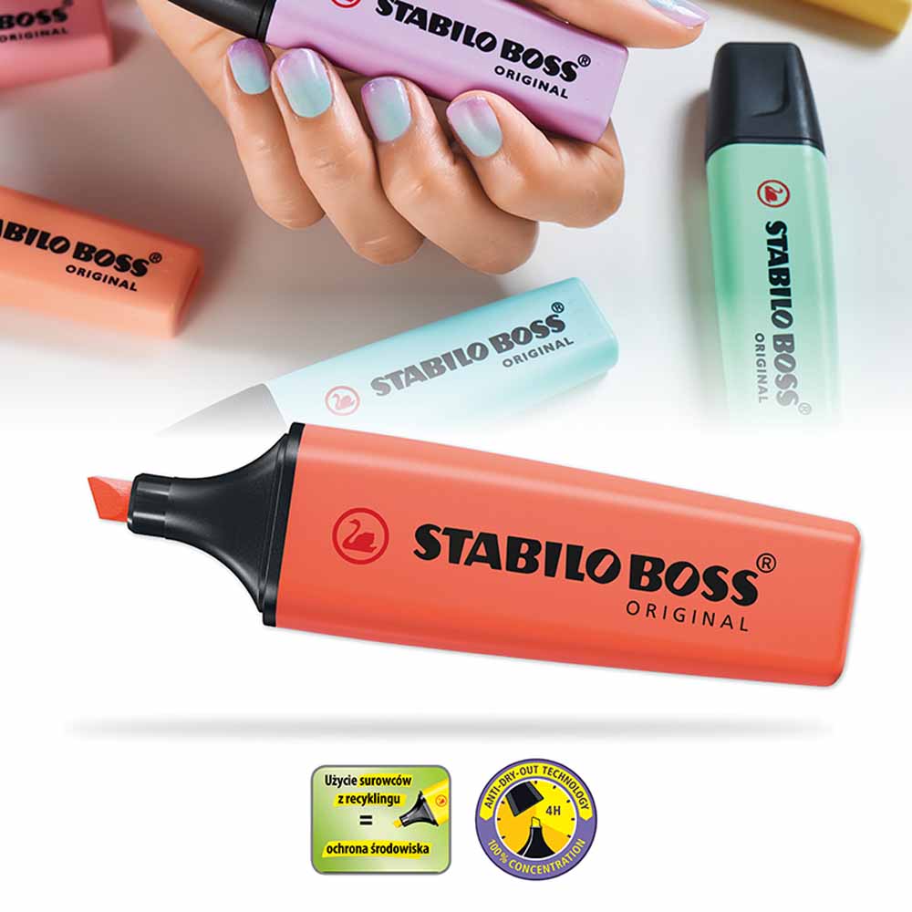 STABILO BOSS ORIGINAL dba o środowisko - wszystkie czarne elementy zakreślacza wykonane są z plastiku pochodzącego z recyklingu. Zakreślacz jest również łatwy do ponownego napełnienia, co redukuje ilość odpadów.