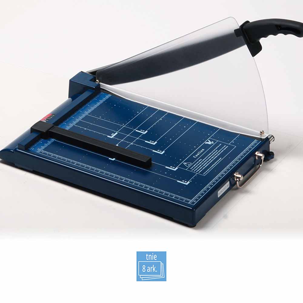 Gilotyna RC 321 N posiada kompaktowe wymiary blatu (320×190 mm), co czyni ją idealnym narzędziem do małych przestrzeni biurowych. Solidna konstrukcja i dwuletnia gwarancja gwarantują długotrwałe i bezproblemowe użytkowanie.