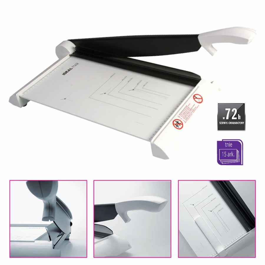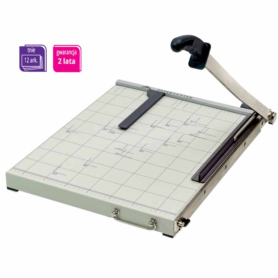 Blat roboczy gilotyny wyposażony jest w antypoślizgową podstawę, co gwarantuje stabilność podczas pracy. Plastikowa osłona zabezpieczająca oraz ergonomiczny uchwyt dodatkowo zwiększają komfort i bezpieczeństwo użytkowania, minimalizując ryzyko przypadkowego skaleczenia.