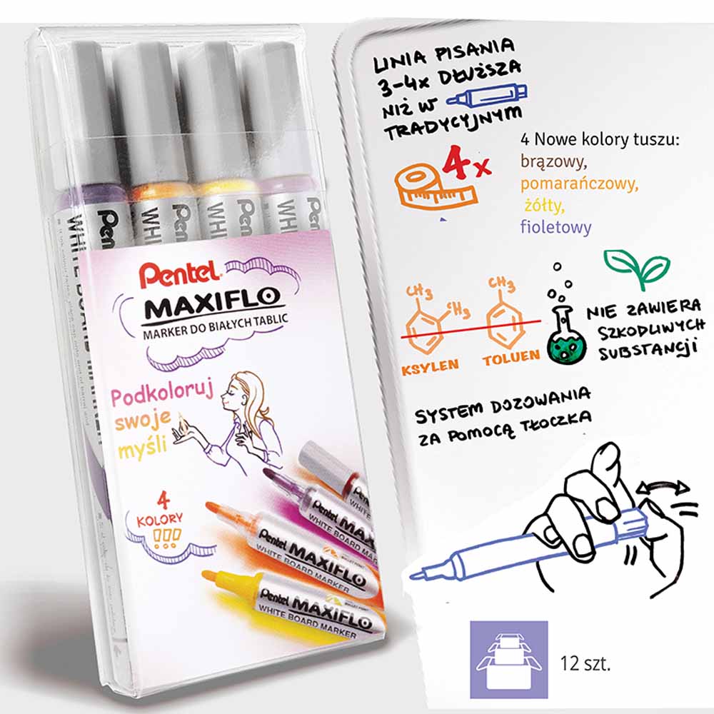 Marker do tablic suchościeralnych Pentel MW85 wyposażony jest w okrągłą końcówkę, która zapewnia precyzyjne i płynne pisanie. Idealny do prezentacji, notatek i rysunków na tablicach suchościeralnych.
