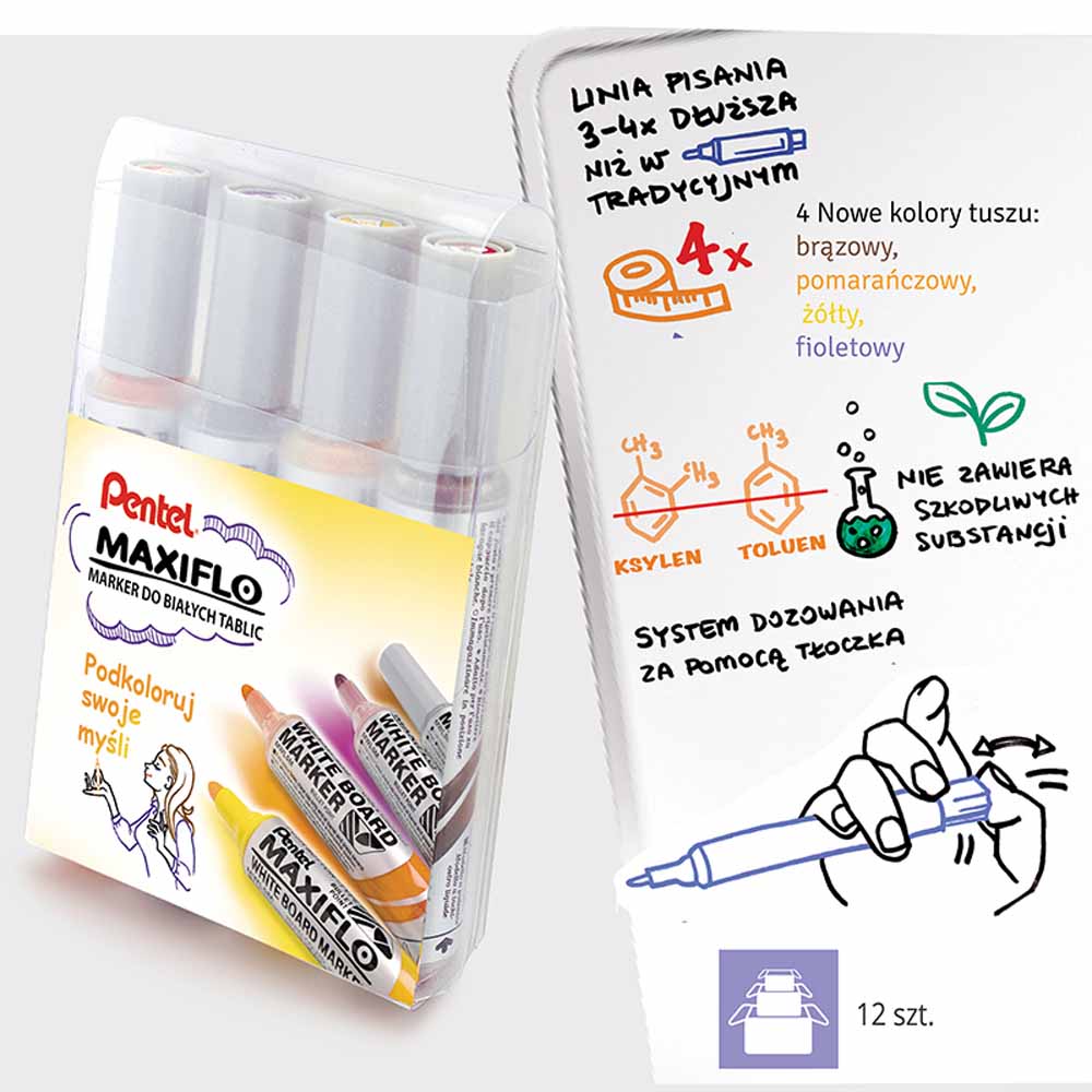 Wyraźne kolory tuszu i łatwość ścierania sprawiają, że marker Pentel MWL5S Maxiflo jest idealnym narzędziem do codziennego użytku na tablicach suchościeralnych.